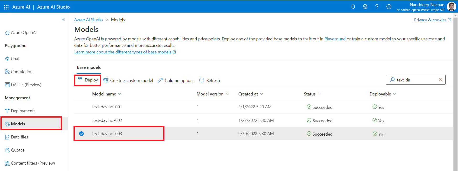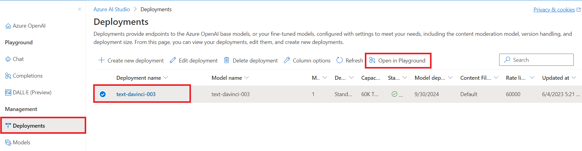 The model will now be available under the Deployments section. Select the text-davinci-003 model and click Open in Playground.