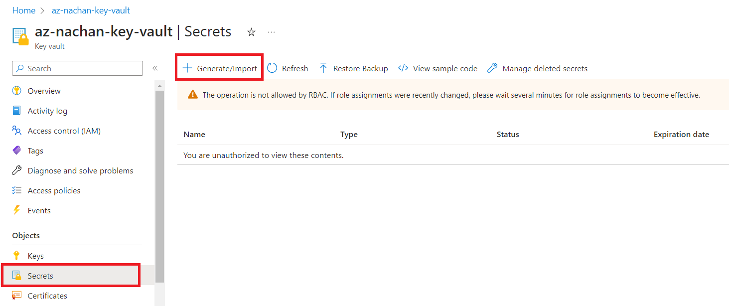 Once the key vault is ready, create a secret by navigating to the Secrets option under Objects.