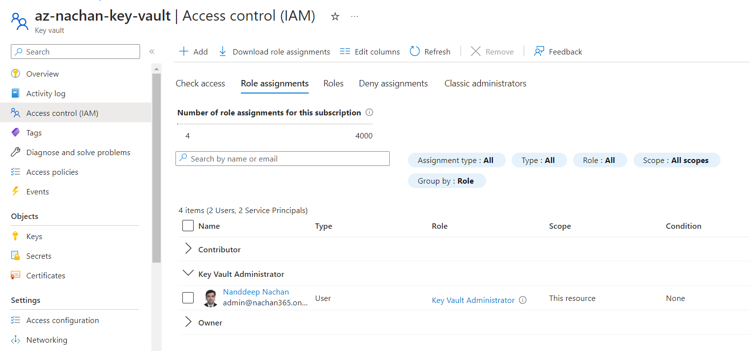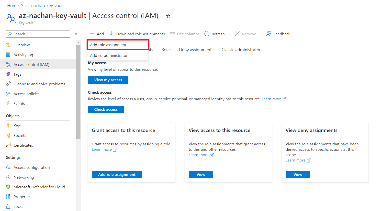 Select the appropriate role (e.g., Key Vault Administrator). Add your user as a member and assign the role.