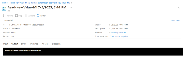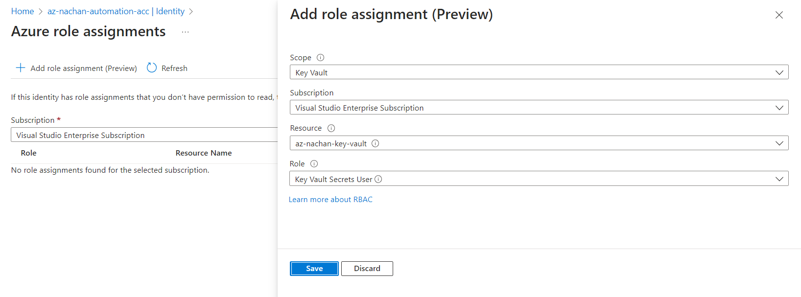 Now, our Azure Automation account has a reader role on the Key vault via managed identity.