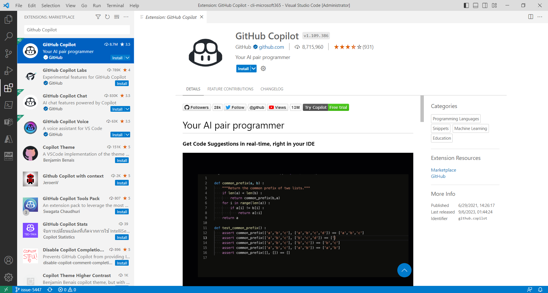 - Search for GitHub Copilot in the Extensions Marketplace.