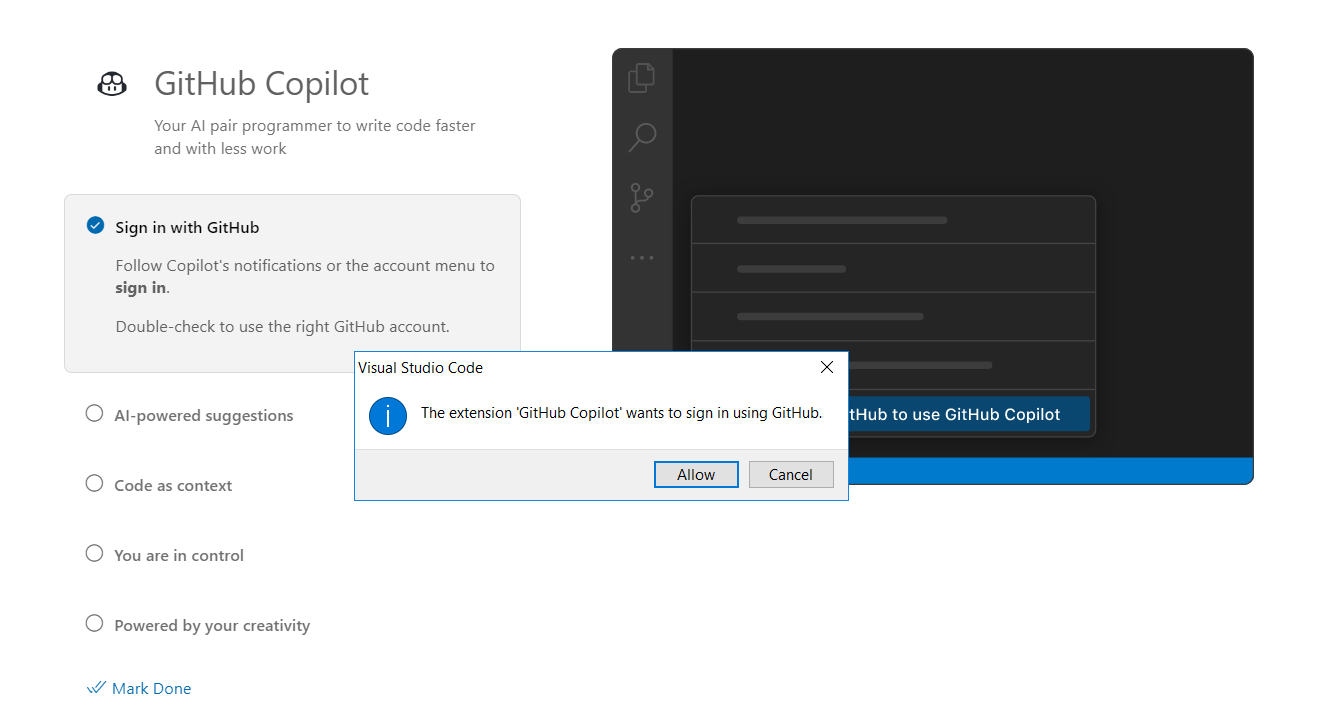 Once you’re signed in to your GitHub account, you may need to authorize GitHub Copilot to access your GitHub repositories. Follow the on-screen prompts to grant the necessary permissions.
