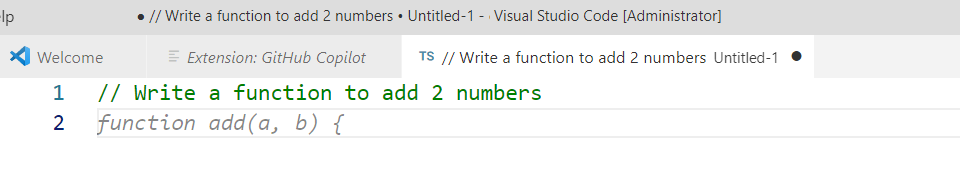 Below is an example of Copilot suggesting a function in TypeScript language for adding 2 numbers: