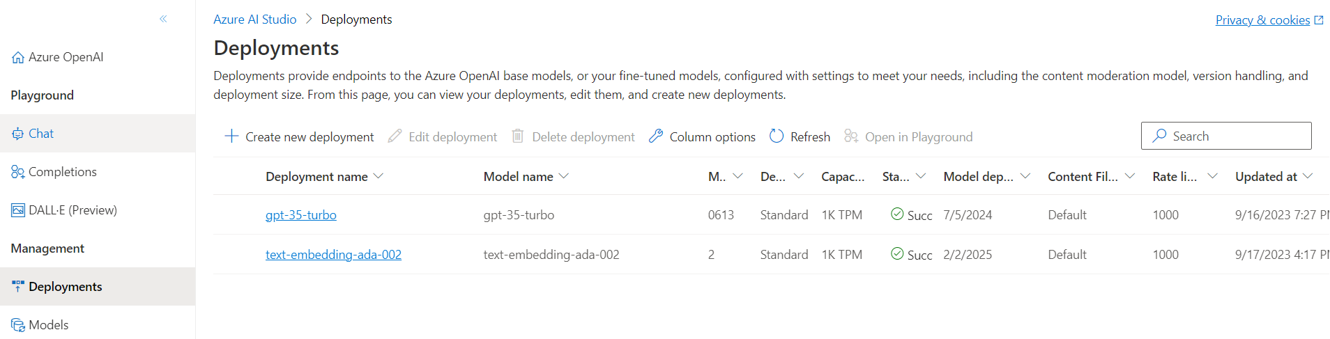 - Search and select the text-embedding-ada-002 and gpt-35-turbo models.