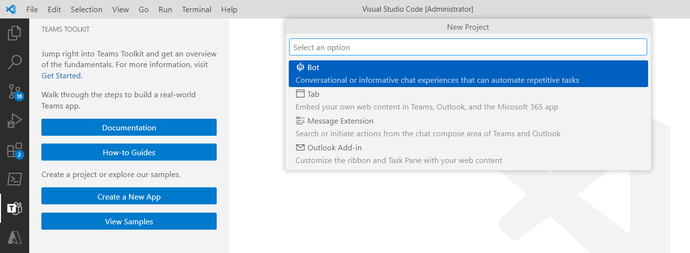 Follow the steps below to create a bot solution with Teams Toolkit.