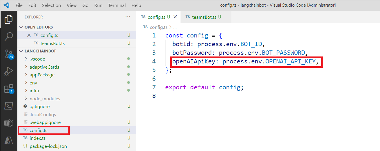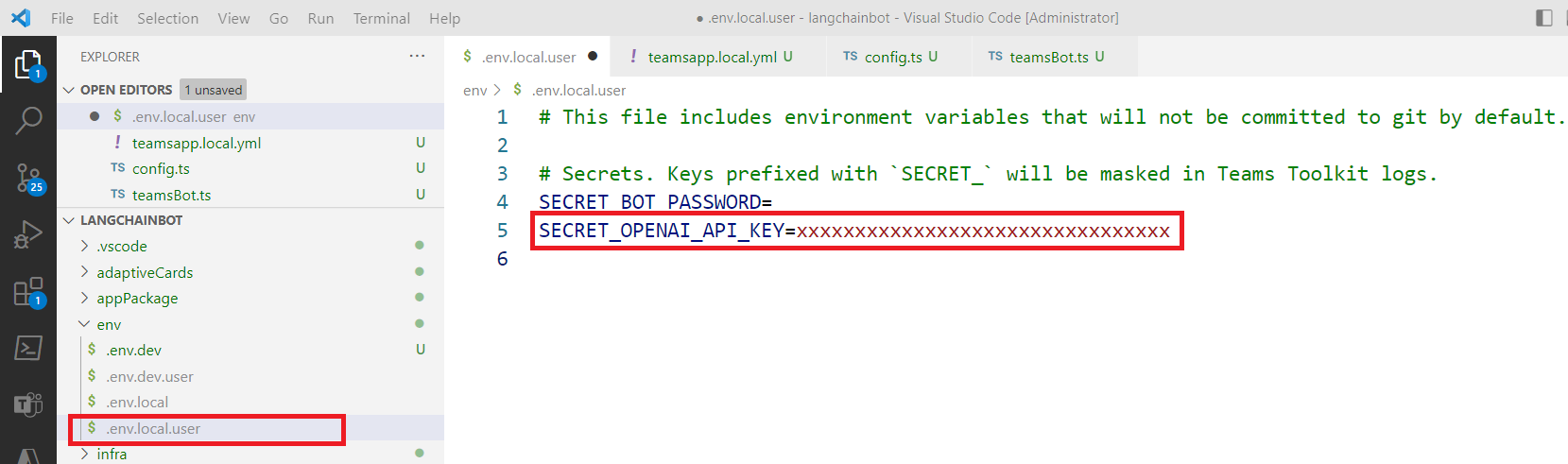 To start with, we will add the Azure OpenAI key to the environment file as shown below: