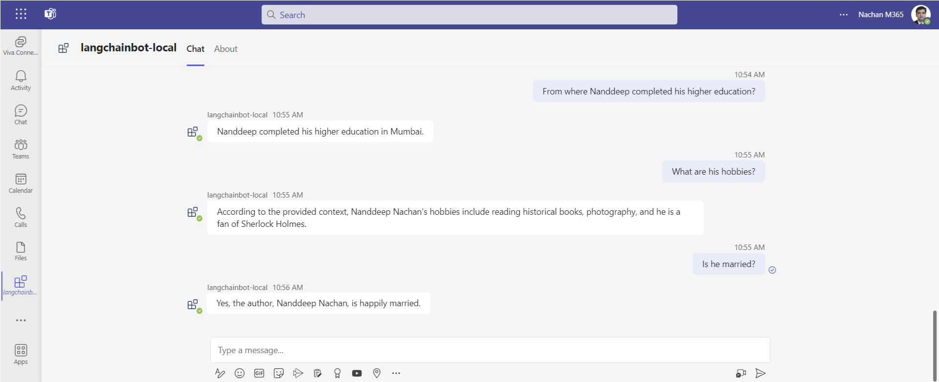 I have provided the About Me page of my blog as my own data. Langchain helps the bot to connect to this data and help answer the questions.