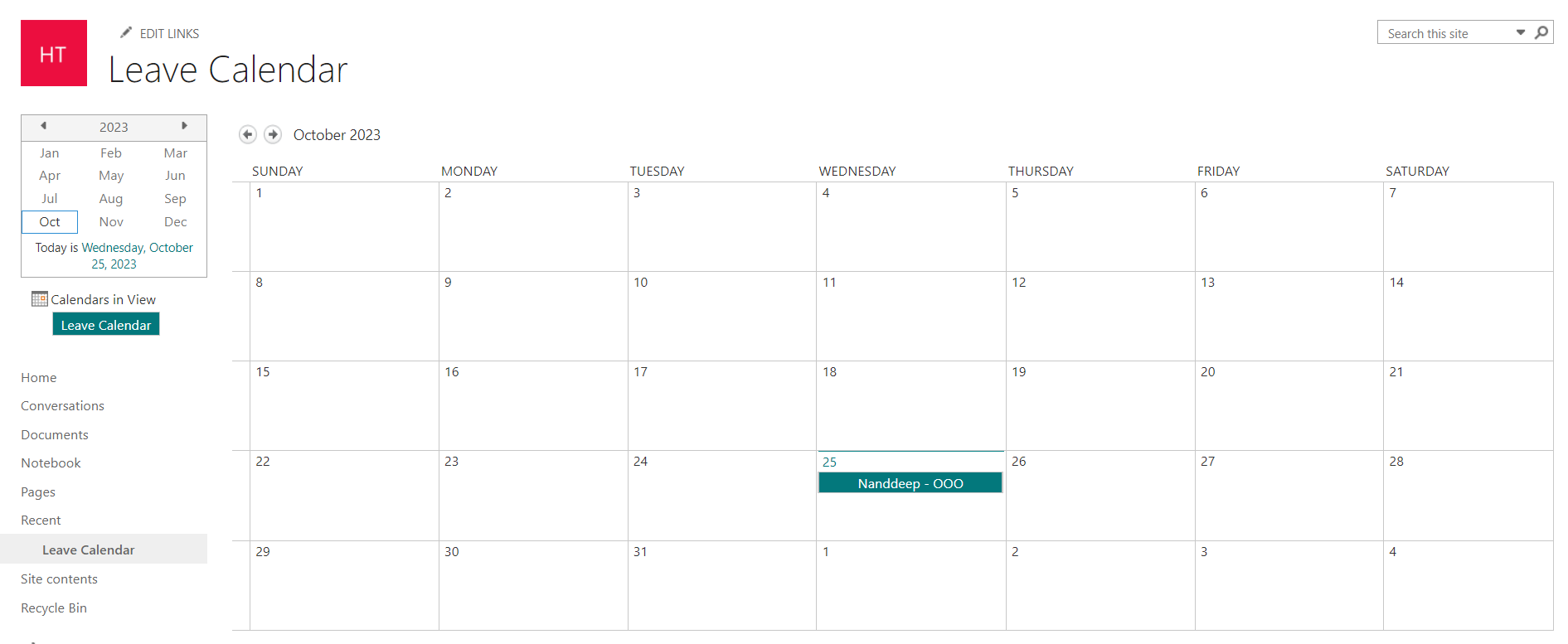 The leaves are maintained on the calendar list named “Leave Calendar” on the SharePoint site connected to the Microsoft Teams team.