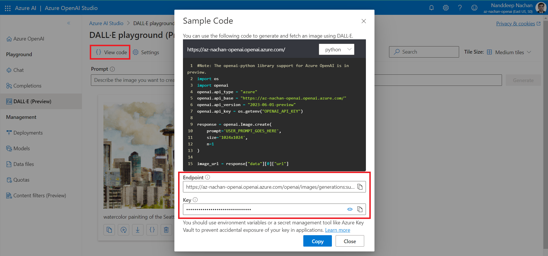 The View code option provides the endpoint and key information on how to consume the Dall-E API.