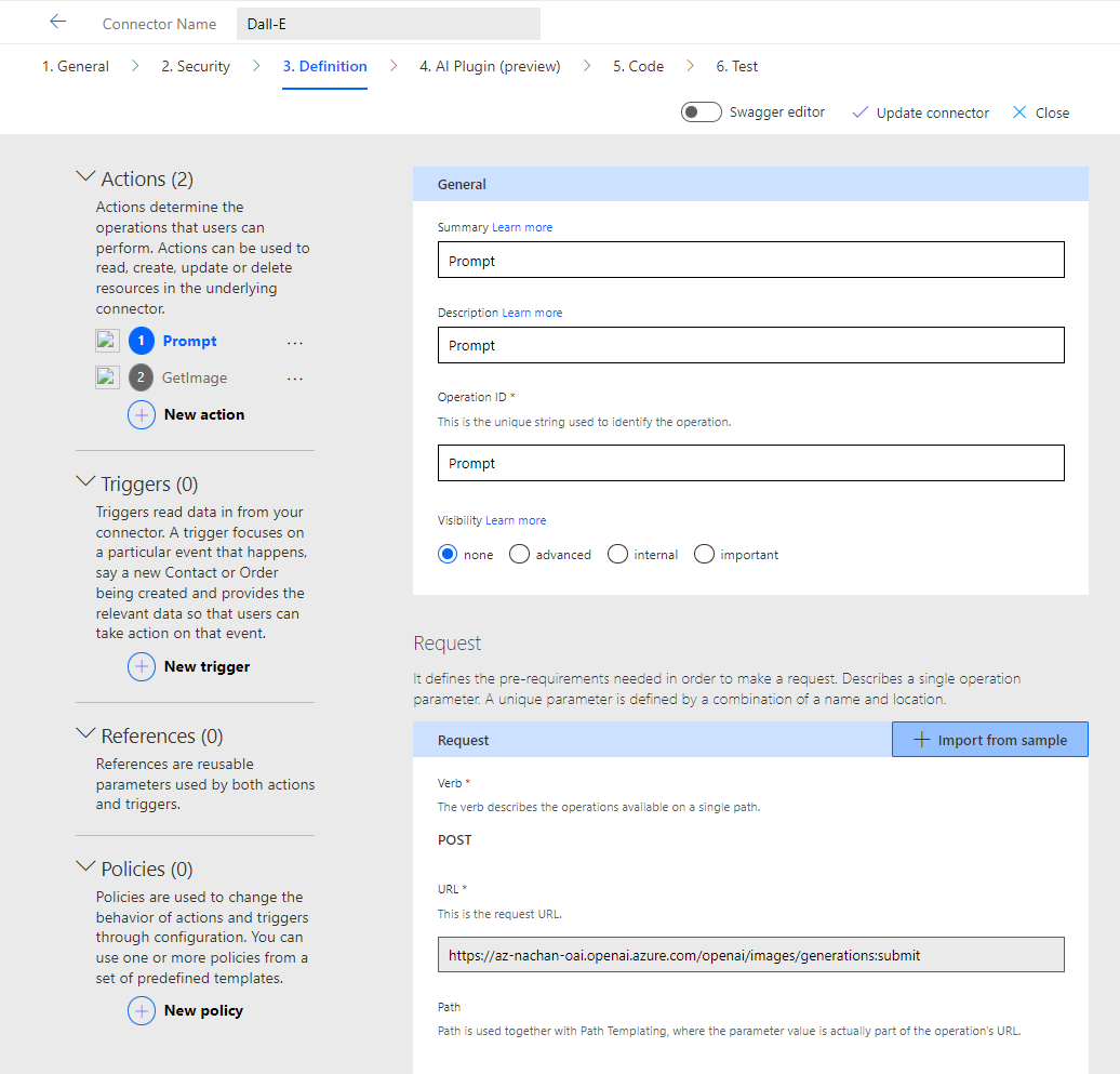 | Timer | OnSelect | Set(varResponse, ‘Dall-E’.Prompt(“2023-06-01-preview”, {prompt: TextInput.Text, n:1, size:”1024x1024”})); |