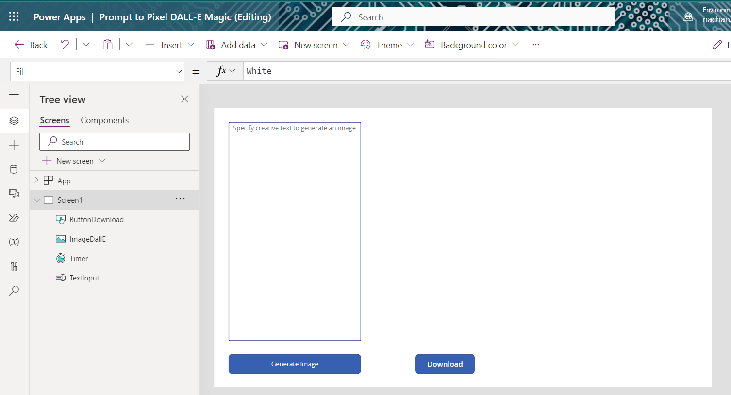 In the Power Apps app, add the custom connector (for e.g., named Dall-E) to get started. The canvas looks as follows with the basic elements in place.