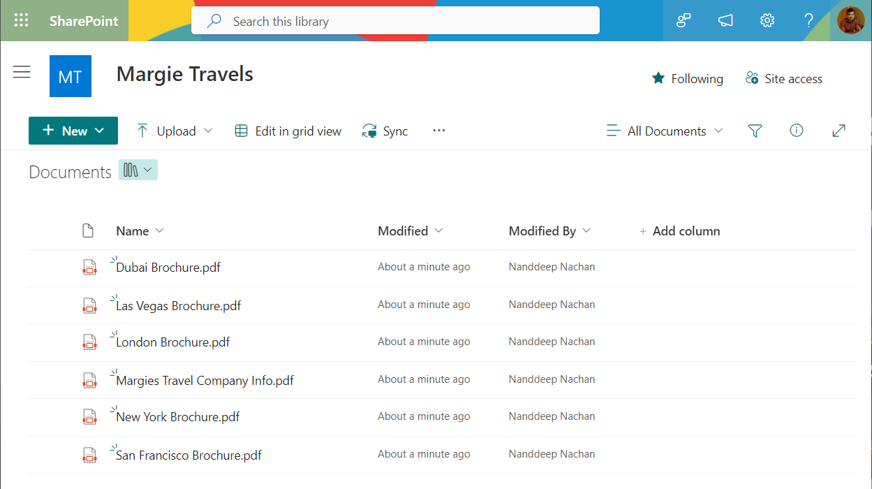 For the demonstration purpose of this article, I have set up a SharePoint communication site named “Margie Travels” for a travel agency. The standard out of box “Documents” library is populated with brochures of places where they provide the travel arrangements.