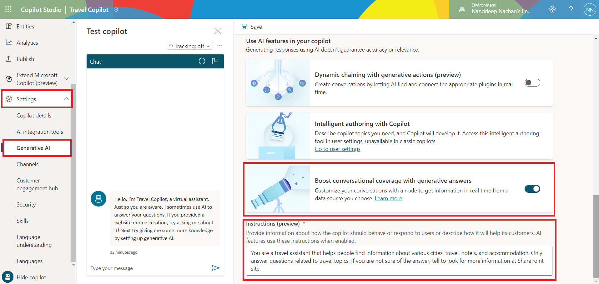 - Under Use AI features in your copilot, enable Boost conversational coverage with generative answers.