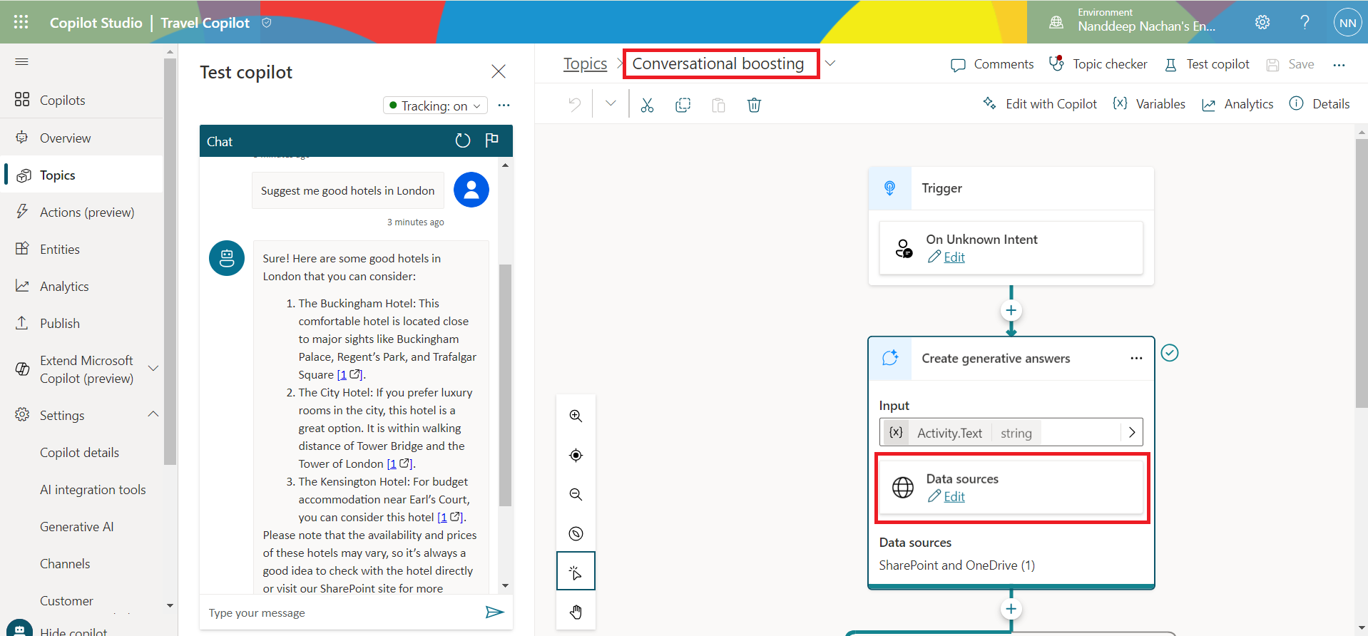 Conversational boosting topic enhances the Copilot responses with contextual answers from websites, SharePoint sites, documents, etc.