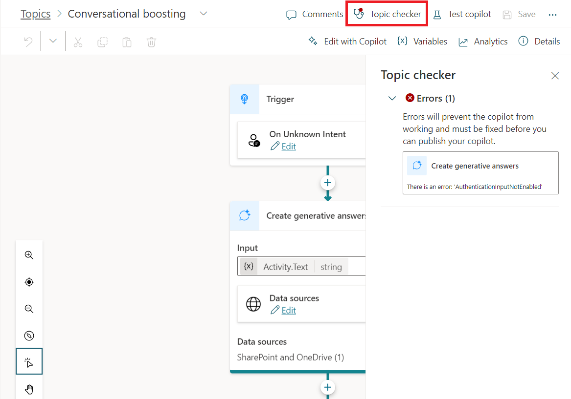 As suggested in the dialog, make sure to publish the copilot. Navigate back to the Conversational boosting topic and make sure no validation error is present.
