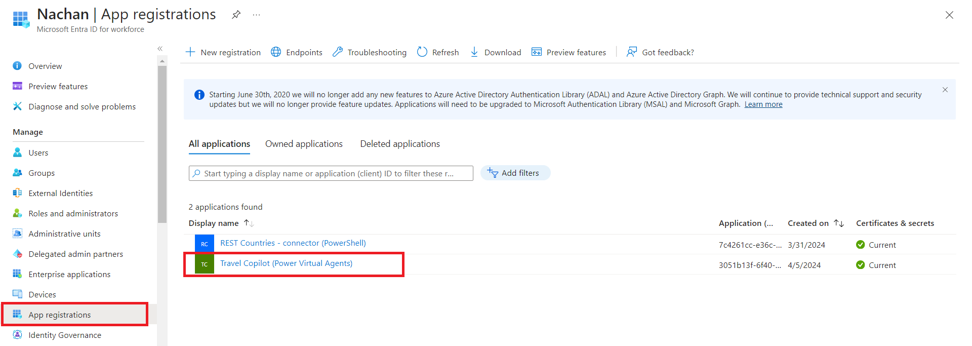 I will use the existing App registration to make further changes.