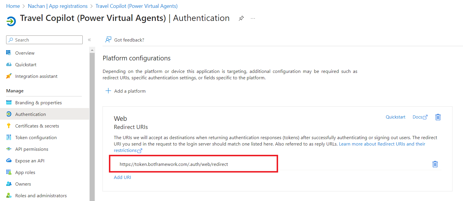 Add the Redirect URI (for e.g. https://token.botframework.com/.auth/web/redirect) shown in the copilot authentication panel.