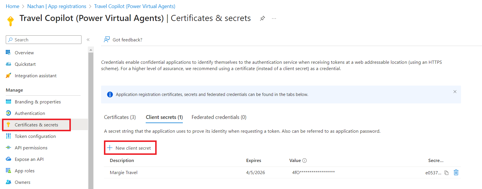 Navigate to Certificates & secrets and generate a new client secret.
