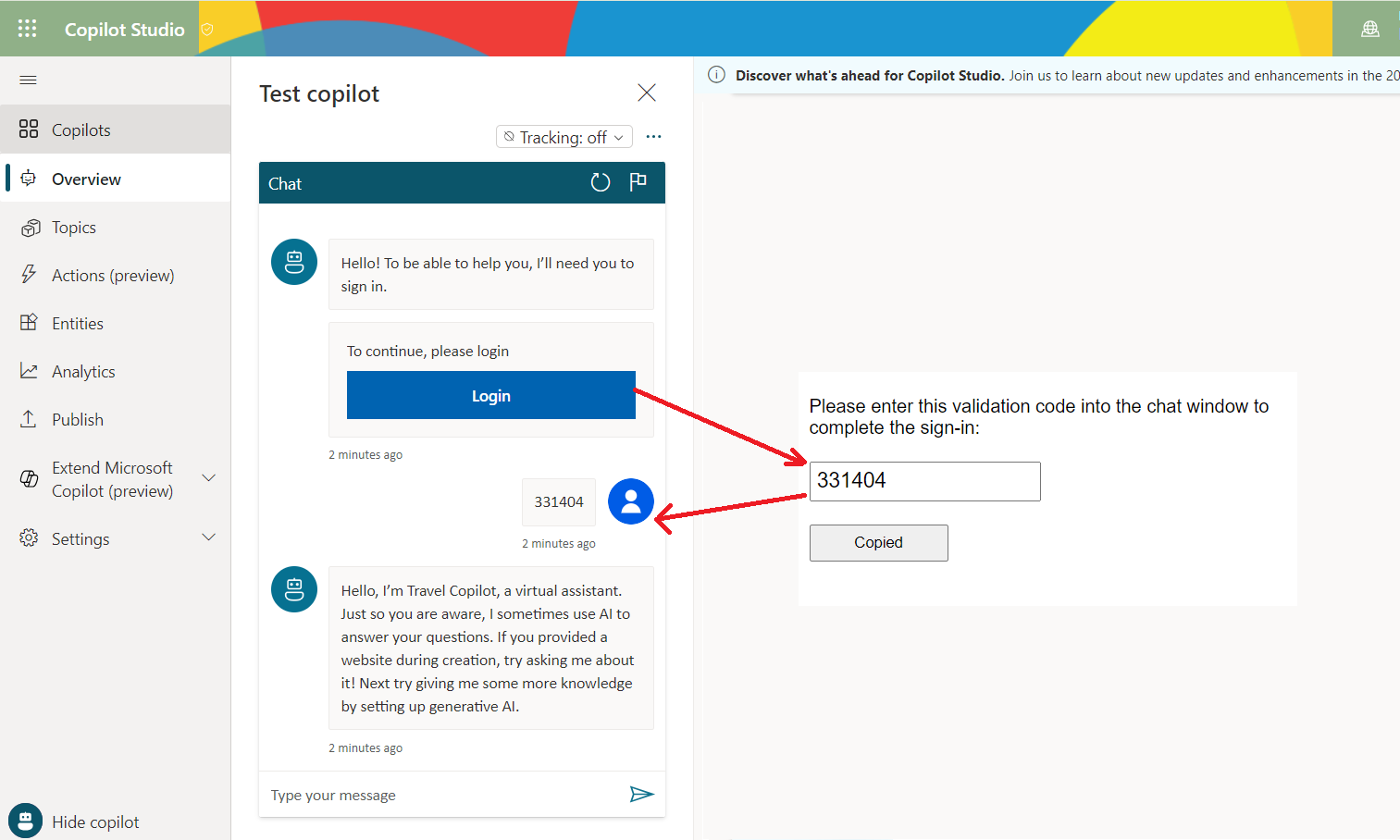 Click the Login button, in the new windows it will generate a code. Paste the code as chat message to start a discussion with your Copilot.