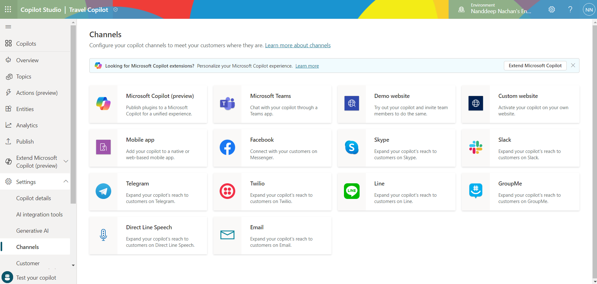 Once you are happy with the Copilot, navigate to Settings > Channels and publish the Copilot to your desired channel.