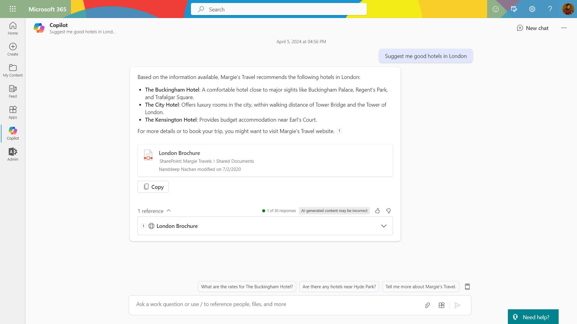 Ask a travel related question to the Copilot and it can answer from SharePoint.