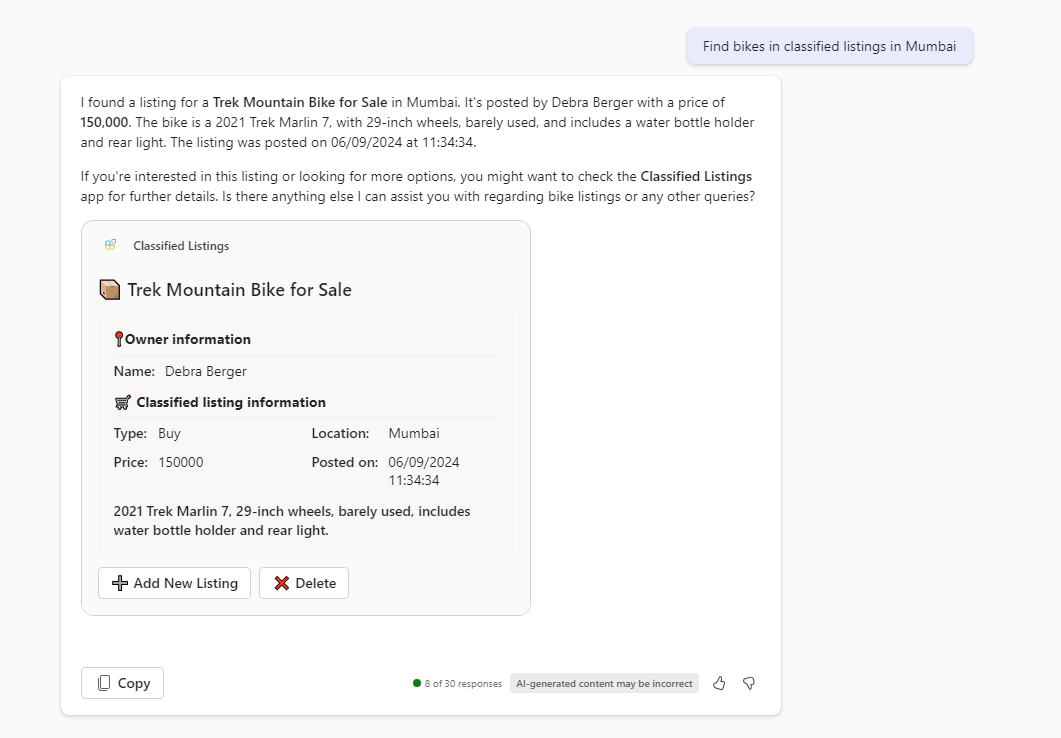 This sample implements a Teams message extension that can be used as a plugin for Microsoft Copilot for Microsoft 365. It allows users to post the classified listings of items they want to sell, buy, or rent. Users can search listings posted by others.