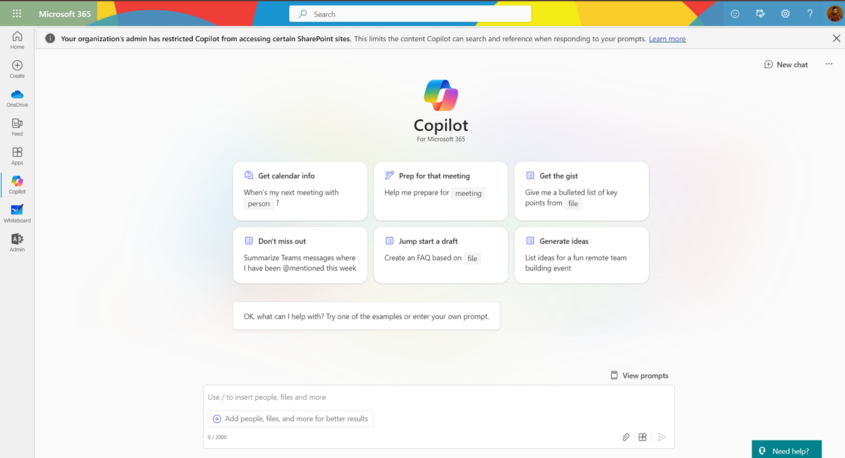 After Restricted SharePoint Search is enabled, Copilot users will see the below message.
