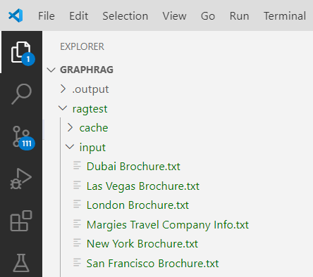 To start with add you data files under /ragtest/input folder. For the demonstration purpose, I have added few travel brochures under the input folder.