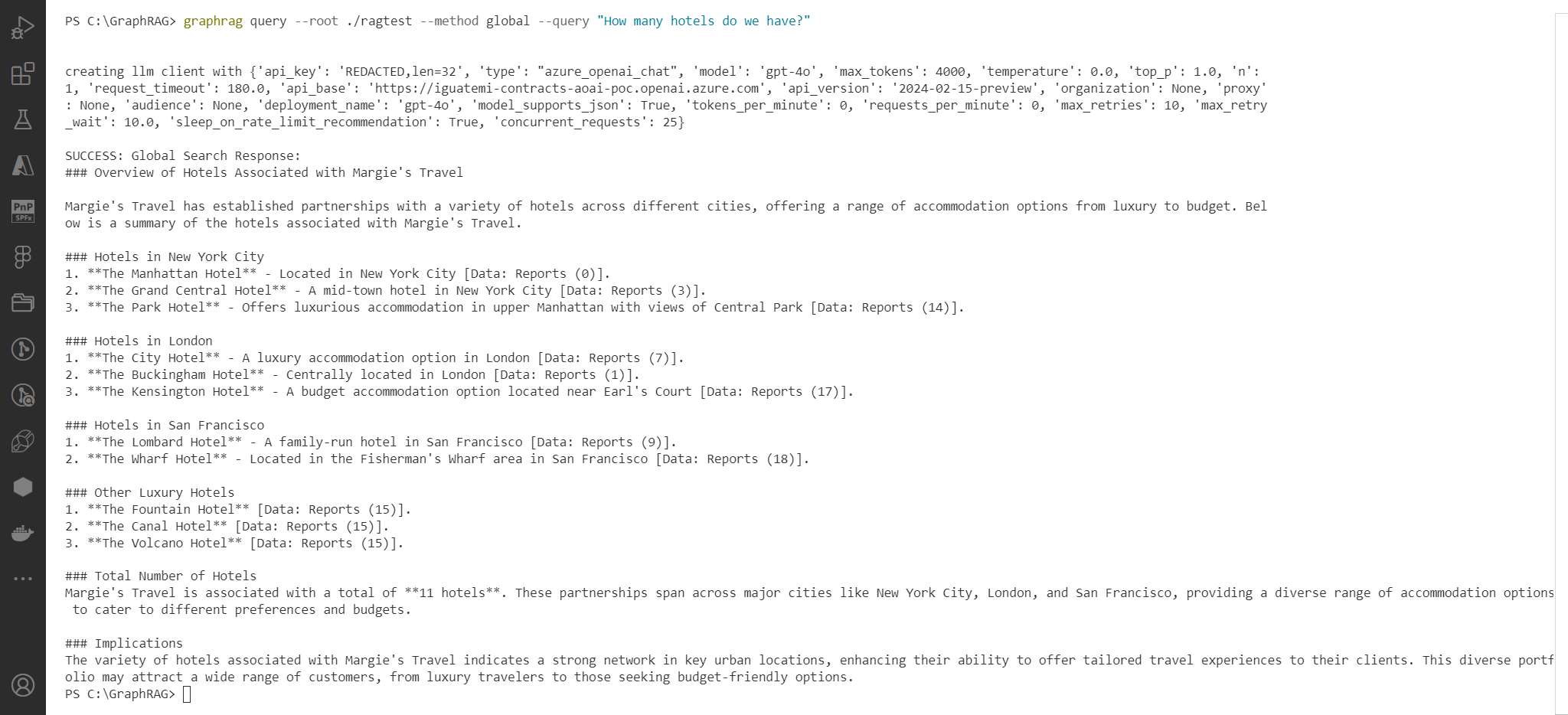 graphrag query --root ./ragtest --method global --query "How many hotels do we have?"